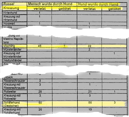 So wird beispielsweise angegeben, dass der Pitbull Terrier im Jahre 2001 in Schleswig-Holstein viermal einen Menschen verletzt habe und Kreuzungen mit dem Pitbull Terrier dreimal. Oder etwa der Deutsche Schäferhund 50 mal Menschen verletzt habe und seine Kreuzungen 26 mal, sowie Mischlinge 46 mal. Aus welchen Rassen die Mischlinge stammen, bleibt unklar, aber aufgrund der großen Populationsdichte des Deutschen Schäferhundes ist dieser auch bei Mischlingen nach Aussagen von Experten am stärksten vertreten. In der Spalte der Statistik, in welcher die Anzahl der durch einen Hundebeißunfall getöteten Menschen angegeben ist, ist für das Jahr 2001 die Zahl 1 vermerkt und zwar unter „Mischling“. D.h. nach der von Innenminister Buß zur Verfügung gestellten Statistik gab es 2001 einen menschlichen Todesfall durch einen Hund, und dieser Hund sei ein Mischling gewesen.