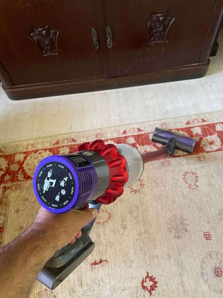 Die Saugleistung des Cyclone V10 ist durchaus zufriedenstellend sowie auch die Akku-Kapazität. Unser erster Dyson Handstaubsauger hatte nur eine Akku-Kapazität von 5-6 Minuten, der V10 rund 60 Minuten. Der Preis für diese gute Leistung ist jedoch ein hohes Gewicht von 2,5 Kilogramm und ein unhandliches Gehäuse. Mit einer Höhe von 256 mm, einer Breite von 250 mm und einer Länge von 1.241 mm ist er ein schweres und großes »Saugmonster«, aber dafür ein starkes. Bei der Saugleistung hält der Dyson Cyclone V10 problemlos mit einem kabelgebundenen Staubsauger mit. Schade ist, dass man den kleinen Bürstenaufsatz nicht drehen kann, wie bei den älteren Modellen. Auch die Entleerung des Staubbehälters gestaltet sich – zumindest bei unserem Gerät – etwas hakelig und klemmt regelmäßig.
