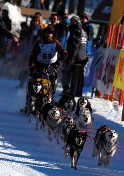 Schlittenhunderennen: Ein 12-Hunde-Gespann auf dem Trail, Schnee, eisiger Wind, bittere Kälte, wenig Schlaf, kräftezehrende Strapazen für Mensch und Tier. Vom dick vermummten Musher sieht man nur die Augen und den weißgefrorenen Vollbart. Er steht auf dem Schlitten und redet leise mit den Huskies, die konstant ihre Geschwindigkeit laufen. Abends am Checkpoint streichelt der Mann die Hunde liebevoll und versorgt sie nach der anstrengenden 48 km-Etappe, bevor er sich um sich selbst kümmert.
