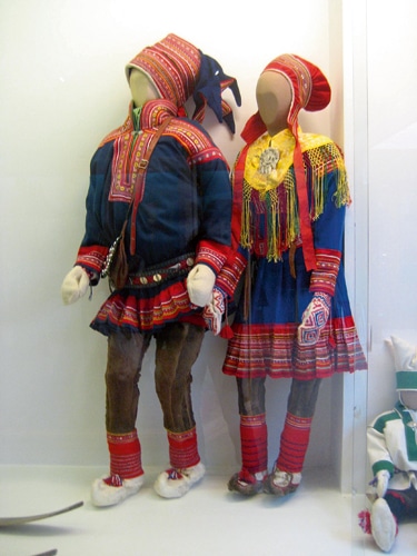Ein Rundgang im Museum ­informiert über das Leben der Sami von der Vergangenheit bis zur Gegenwart und zeigt unter anderem die verschiedenen Samitrachten, die mich an die Kleidung der Ungarn und Bulgaren erinnern. Da der Ort Karasjok sich für die Herstellung der ­Jagdmesser der Sami rühmt, erstehe ich ein Original Sami-Messer als Souvenir. Später erfahre ich, dass der Stahl aus Deutschland importiert ist, die Form des Messers in Schweden vorgegeben wurde und das Holz für den Griff aus Norwegen (oft auch aus Russland) stammt. In Karasjok wurde dann der Griff hergestellt und das Messer zusammengesetzt. Ich fahre einen Umweg zu einer Häuser­ansammlung mit dem Namen Maze, die im Reise­führer ebenfalls als einer der ­wichtigsten Orte der Sami beschrieben wird. Leider erweist sich dieses „Samizentrum“ als kleine Ansiedlung mit geschlossenen Läden.