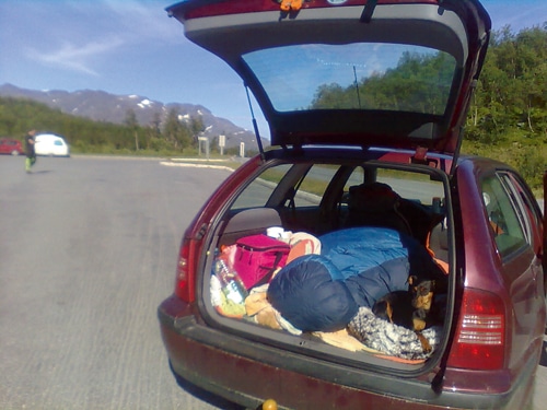 Wie auf der gesamten Reise nächtigen wir wieder im Auto, gemeinsam im Daunenschlafsack eingekuschelt. Die Ladefläche meines Kombis misst 2 Meter – mehr als genug Platz für Nini und mich. Auch wenn Hunde in Hotels und kleine Pensionen, manchmal auch ohne Mehrkosten, mitgenommen werden dürfen, so spart das Schlafen im Auto nicht nur die Kosten der Nächtigung (pro Nacht mit Frühstück im Schnitt 70,- Euro), sondern auch die Suche nach einem passenden Quartier.