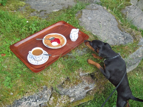 Bei wolkenlosem Himmel buche ich die 4-stündige Fahrt mit dem Urlaubsfjordschiff in den Sognefjord, dem längsten und tiefsten Meeresarm der Welt, dessen tiefster Punkt 204 km von der Küste entfernt ist, DIE Touristenattraktion schlechthin. Nini ist mit an Bord, wird von anderen Besuchern mit „ach wie süüüüüüß“ betüdelt, und ich komme mir vor wie ein Neckermanntourist. Der ausgleichende Nachmittagsspaziergang mit Nini führt nach Otternes, einem alten Dorf, das bereits in Schriften des 12. Jahrhunderts erwähnt ist. Als zusätzliche Entschädigung für das lange Stillhalten auf dem Urlaubsschiff lasse ich sie an dem ungewohnten, aber für diese Gegend typischen Essen teilhaben: Sauerrahmporetsch mit Lammfleisch, Ziegenwurst, schimmliger Käse, Flachbrot, Rentierwurst.