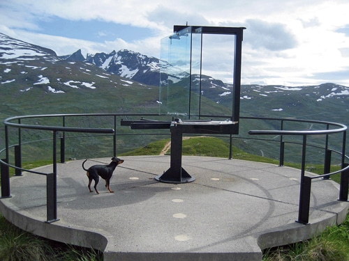 Landschaftlich wunderschön, vorbei an malerischen Wasserfällen, durch unzählige Tunnel, schlängeln sich die Landesstraßen mit grottenschlechtem Straßenbelag entlang des Fjords. Spät abends erreichen wir noch Dalsnibba, mit 1500 Metern der höchste Aussichtspunkt dieser Landesstraße. Es hat null Grad, und da in der „Hytter“, was so viel wie „Hütte“ bedeutet, Hunde nicht gestattet sind, schlafen wir wie gewohnt im Auto. Nach dem Frühstück im Auto, das ich wie üblich mit Nini teile, lässt ein traumhafter Spaziergang an diesem höchsten Aussichtspunkt die kalten Morgenstunden vergessen. Nini hüpft wie eine Gämse über die Felsblöcke nahe des Felsabbruches und ich nehme sie vorsorglich an Brustgeschirr und Leine. Über die Trollstigen, die Serpentinen der E136 nach Alesund und Vestnes, erreichen wir die Fähre nach Molde, der Rosenstadt, in der auf Grund der für diesen Breitengrad ungewöhnlich milden Temperaturen viele Rosengärten angelegt sind.