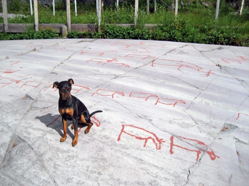 In Alta, der größten Stadt der norwegischen Provinz Finnmark, begehen wir den Lehrpfad des Freilichtmuseums und Nini springt unbeschwert über die Steinritzungen aus der Steinzeit, die vor ca. 6.500 Jahren entstanden. Diese sind die bedeutendsten Beweise der prähistorischen Besiedelung Nordnorwegens – und haben den Status als UNESCO-Welterbestätte.
