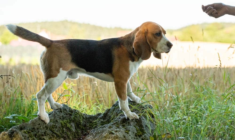 2.) Bieten Sie Ihrem Hund nun ein Leckerchen an. Dabei ist die Position des Leckerlis entscheidend, damit sich Ihr Hund nicht hinsetzt, sondern direkt in die Stehposition wechselt. Zeigen Sie Ihrem Hund das Leckerli zunächst direkt vor seiner Schnauze auf dem Boden und bewegen Sie es dann zügig in Richtung Ihres Bauches. Dabei sollten Sie eine gerade Linie verfolgen und Ihre Hand nie senkrecht nach oben ziehen, sondern immer im schrägen Winkel in Richtung Bauch. Die Endhöhe der Leckerlihand gibt Ihr Hund vor, sie entspricht seiner Schnauzenhöhe in stehender Position. Klicken Sie Ihren Hund zunächst wirklich für die Bewegung, hilfreich ist ein Klicken der Hinterbeine.
