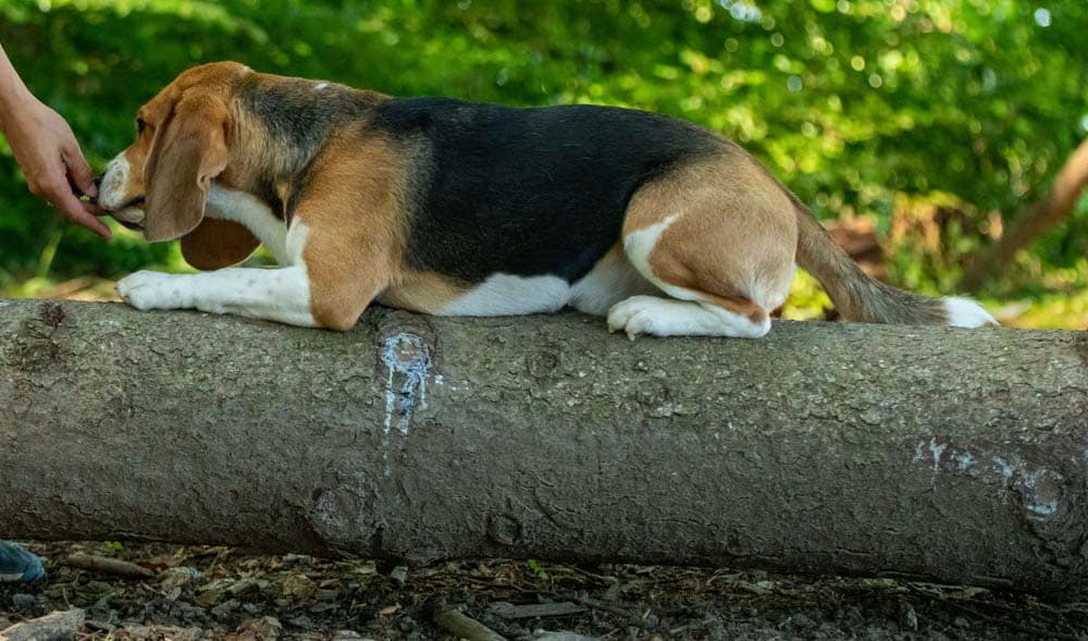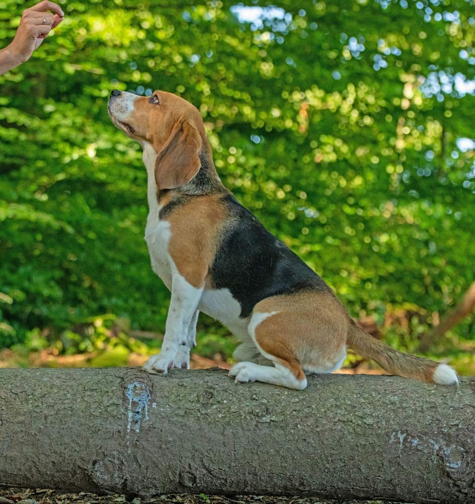 2.) Begeben Sie sich direkt vor Ihren Hund, der sich noch mit seinen Vorderpfoten auf dem Baumstumpf befindet und bieten Sie ihm den Handtarget auf Schnauzenhöhe mittig Ihres Körpers an. Wiederholen Sie dies mindestens 5 Mal.