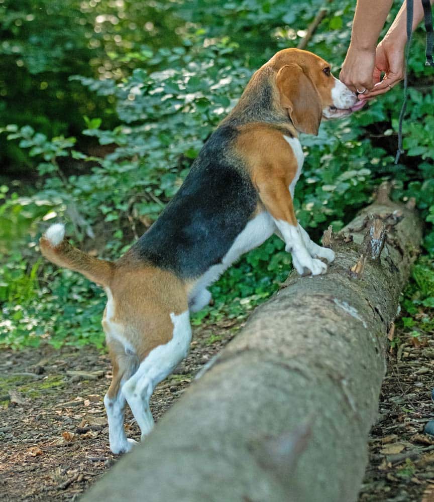 1.) Klicken Sie jegliches Interesse am Baumstumpf und Ihr Hund wird recht zügig versuchen, seine Pfoten auf den Stumpf zu stellen. Diesen Moment belohnen Sie großzügig, Ihr Hund verbleibt dabei auf dem Baumstumpf. Sollte Ihr Hund nicht mit den Pfoten auf dem Baumstumpf stehen möchten, prüfen Sie, ob er wackelt und helfen Sie Ihrem Hund ggf. mit dem Handtarget.