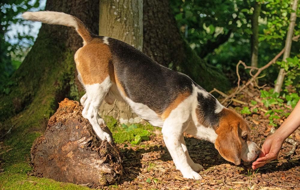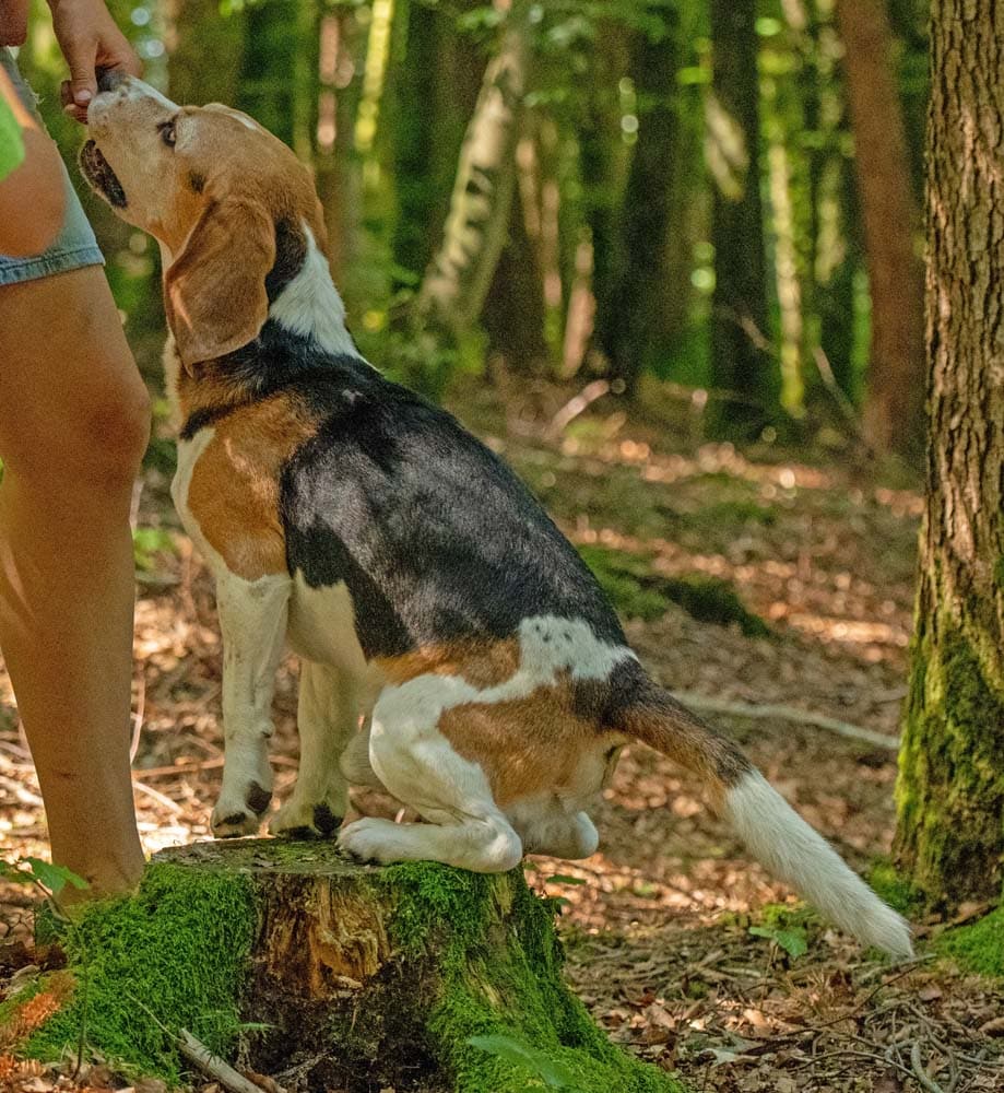 3.) Jetzt können Sie anfangen, sich langsam um den Baumstumpf herum im Kreis zu bewegen. Zunächst nur minimal, sodass Ihr Hund nur den Kopf zur Seite recken muss. Dies klicken und belohnen Sie.