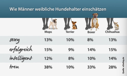 Männer finden Halterinnen von Chihuahuas besonders sexy. Dies ergab eine Umfrage der Partnervermittlung „eDarling" und des Vermittlungsportals „betreut.de" unter 1.290 Mitgliedern. Ein Date hätten sie jedoch am liebsten mit einer treuen Mopsbesitzerin. Frauen hingegen bevorzugen die Herrchen von Boxern: Die gelten als erfolgreich, intelligent und sexy.