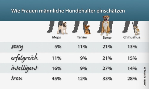 Die Online-Partnervermittlung eDarling und das Vermittlungsportal betreut.de haben 1.290 Mitglieder nach ihren Assoziationen zu Eigenschaften von Haltern ausgewählter Hunderassen befragt. Je nach Hunderasse assoziierten die Teilnehmer der Umfrage unterschiedliche Eigenschaften mit dem Herrchen oder Frauchen. Das Boxer-Herrchen wurde von den meisten Frauen als sexy, erfolgreich und intelligent eingeschätzt. Nur beim Thema Treue konnte der Mopshalter mehr punkten. Gleichzeitig wird er aber auch als wenig sexy eingeschätzt.