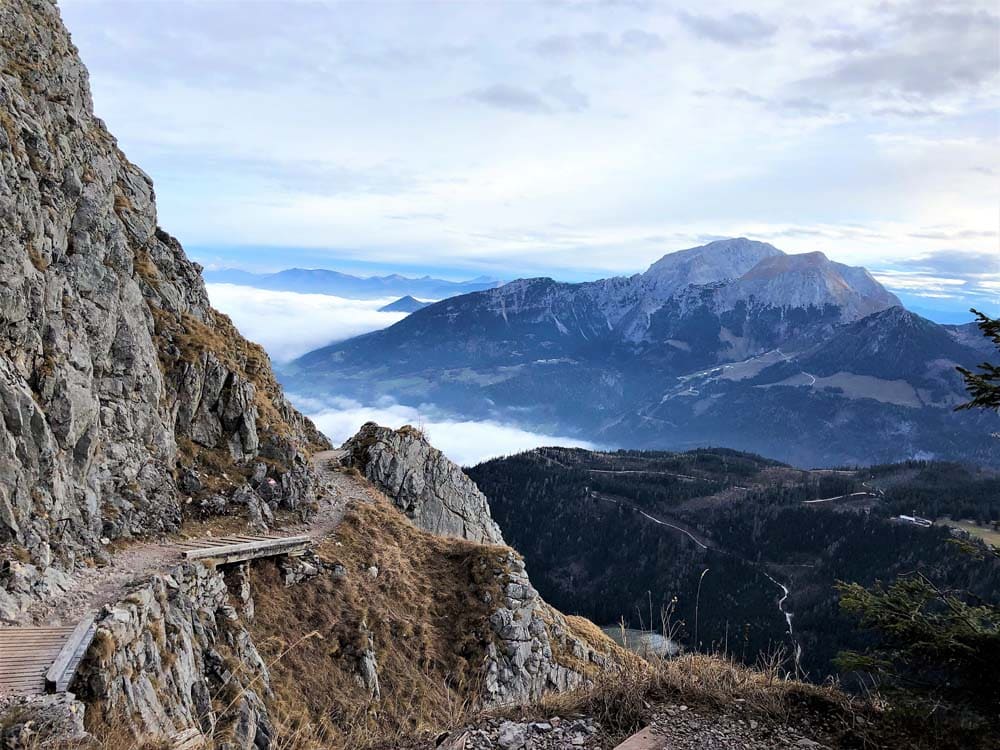 Von Hütte zu Hütte, vom Tal auf die Berge der Berchtesgadener Alpen und ja, vielleicht auch vom Sonnenschein in den Schnee, denn der höchste Punkt der Tour liegt immerhin auf 2.250 m. Dennoch verlangt die Hüttenwanderung kein übermäßiges alpinistisches Können, dafür umso mehr eine gute Kondition. Für mich unvergesslich: Bergdohlen im Morgengrauen mit Nüssen füttern, während die Berge im Hintergrund umhüllt vom Nebelmeer sind.
