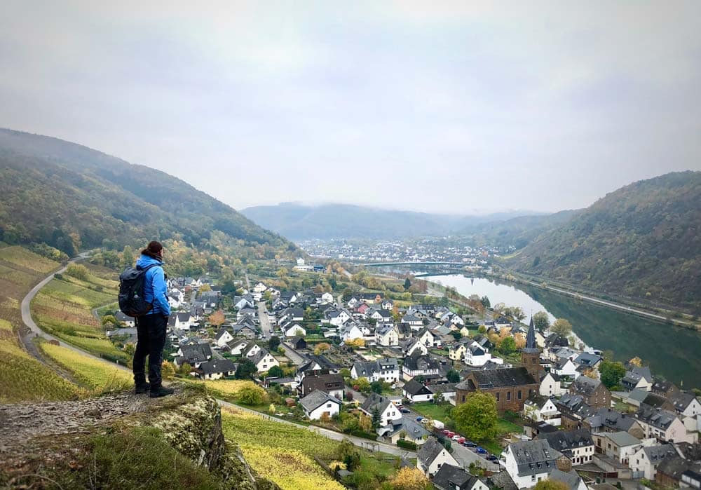 Immer wieder verzücken mich die vielen Schleifen, die sich die Mosel durch Schiefer und Fels gebahnt hat und die ich von aussichtsreichen Punkten betrachten kann. Weinreben säumen das Ufer. Mit etwas Glück findet der Wanderer an den Weinstöcken der hoch dekorierten Weingüter im Herbst noch eine süße Traube. Aber Achtung, in den Mund darf nur, was in eine Hand passt. Der Wein der Region wird wiederum vielerorts gern zur Probe und zum Kauf angeboten – und mit dem Geschmack von Riesling auf der Zunge wandert es sich beschwingt zum Ziel der Tagesetappe.