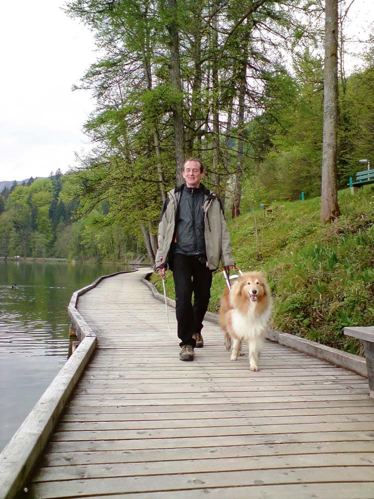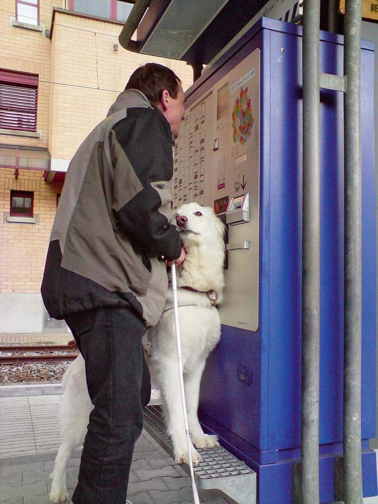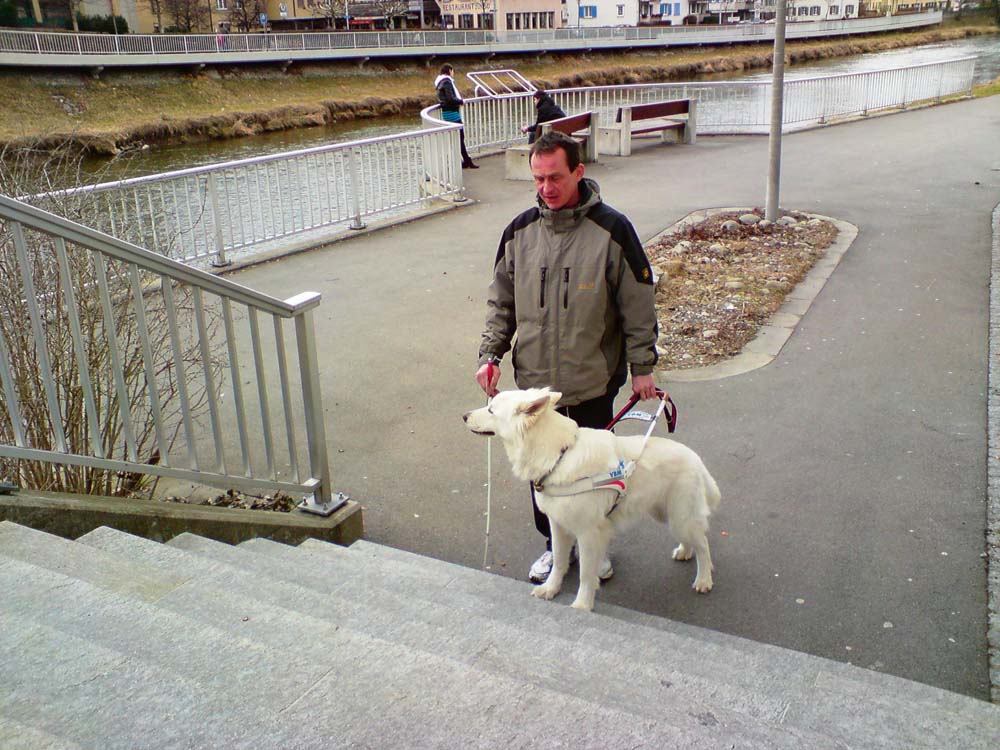 Ich selbst konnte es auch schon einmal erleben: Im Rahmen einer Jubiläumsfeier wurden mir die Augen verbunden. Dann gab mir Renato seinen Gael im Führgeschirr an die Hand. Ich danke ihm heute noch für diesen riesengroßen Vertrauens­beweis. Blinde Menschen geben ihre Hunde nicht so gern aus der Hand. Und dann ging es los: Renato flüsterte mir die richtigen Kommandos ins Ohr und Gael führte mich in das Hotel, in dem wir logierten. Gael zeigte mir die Treppe an, führte mich zum Zimmer und zeigte die Tür an. Zurück ging es zum Lift, bei dem mir Gael mit seiner Nase den Knopf anzeigte. Er führte mich sicher in den Aufzug und auch sicher wieder hinaus. Unten im Speisesaal angekommen, führte Gael mich souverän und sicher zurück zu meinem Stuhl.
