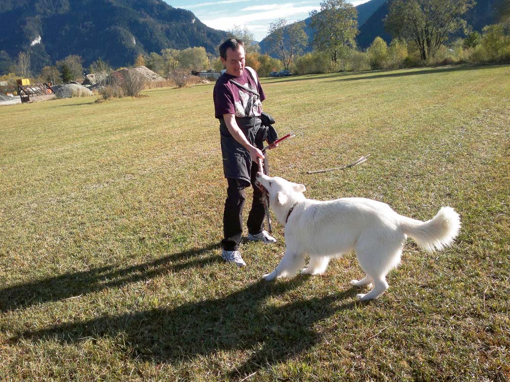 Werden die Hunde aus dem Führgeschirr genommen, benehmen sie sich wie ganz normale Hunde, sie spielen, buddeln, schwimmen oder chillen einfach nur. Und die Führhunde von Renato Alfieri durften sogar Spaß-, Spiel- und Trickkurse bei mir in Oberammergau machen. Die Qualität ihrer Arbeit hat darunter nie gelitten.