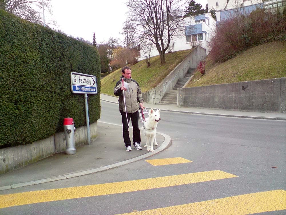 Gehen wir einmal mit offenen Augen durch unsere Straßen. Da sind viele, ja oft sehr viele weiße Streifen auf der ­Straße: Parkplätze sind durch weiße Linien rechteckig abgegrenzt, Parkverbotszonen sind mit Zick-Zack-Linien markiert, Abbiegespuren, Mittelstreifen, Fahrrad- und Fußgängerbereiche usw. werden vielerorts durch weiße Linien begrenzt. In dieser Situation zahlloser Linien und Streifen soll der Blindenführhund nun genau einen Zebra­streifen unterscheiden bzw. finden können?