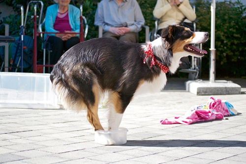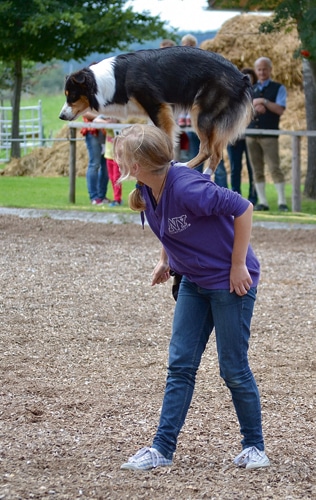 Auch bei vielen anderen Events oder auch privaten Geburtstagsfeiern sind die Beiden gern gesehene Gäste. Inez betont aber immer wieder, dass ­hinter Vielem, was leicht aussieht, harte Arbeit steckt. Manche Tricks klappen sofort, andere benötigen hingegen einige Wochen, bis sie wirklich sitzen. Besonders wichtig sind Amys ­Frauchen der Muskelaufbau und die Balancearbeit. Amy ist ein sog. NBT-Aussie, das bedeutet, sie hat eine angeborene Stummelrute. Dies beeinträchtigt sie in keiner ­Weise, nur Tricks, wo Balance gefragt ist, wie beim Springen und Stehen auf den Fußsohlen von Inez, sind ein wenig schwieriger für sie. Und Amy ist ­Perfektionistin. Das hibbelige ­Arbeiten, wie es manche Hunde tun, ist nicht ihres. Sie arbeitete schon immer ruhig und konzentriert, manchmal scheint es, dass sie sich mehr über Fehler ärgert als Inez. So verwundert es auch nicht, dass Amy mit erst 12 Monaten die BH1-Prüfung mit „Vorzüglich" bestand. Ein guter Grundgehorsam ist auch für die von Hundeleuten nicht immer ernst genommene Trickarbeit von Vorteil.