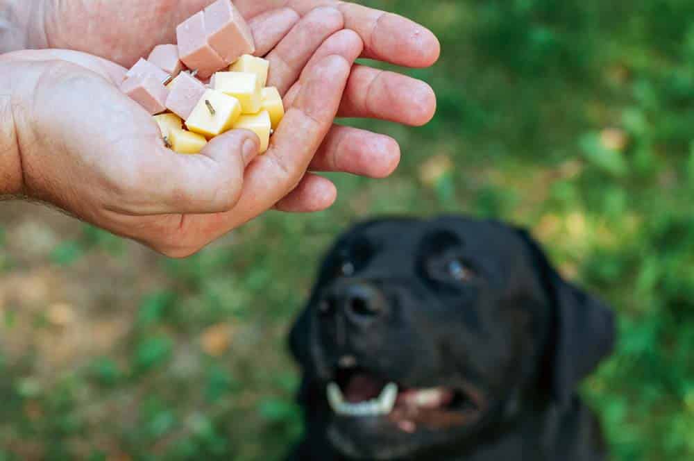 Nun wird ein sogenannter Marker eingeführt: Wir sagen ein Wort wie „Jep!“ und geben unmittelbar darauf ein Stückchen Leberwurst (Geschmacksklasse 2). Dies wird mehrere Male wiederholt. Nun sind wir bereit für das eigentliche Training. Ein Stückchen Gouda (Geschmacksklasse 3) wird gut sichtbar auf den Boden gelegt. Wir gehen mit dem Hund daran vorbei, ohne dass er sich das Stückchen nehmen kann. In dem Moment, in dem der Hund den Käse wahrnimmt, geben wir das Markerwort. Der Hund dreht sich zu uns um und will sich die Leberwurst holen (denn das hat er ja schon gelernt: „Jep“ = Leberwurst). Zur Belohnung bekommt er jetzt nicht nur die Leberwurst, sondern hinterher auch noch den Gouda. Dadurch lernt er, dass er nichts verpasst und er sich bei gefundenem Fressen getrost zunächst uns zuwenden kann.