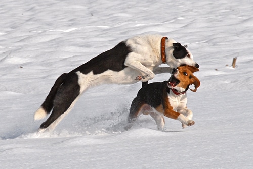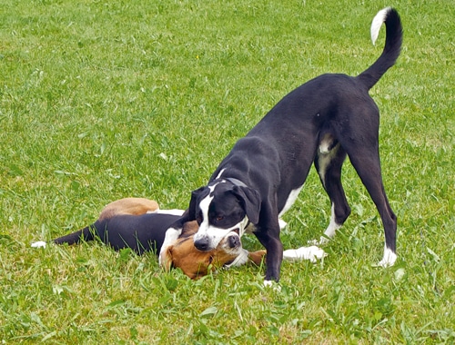 Ich hätte mit meiner Vorgeschichte vermutlich nur noch wenige Chancen gehabt, wenn sich nicht Günes, der Canis autisticus, vehement in meine Erziehung eingemischt hätte. Der alten Dame sind grenzenlose und aufgedrehte Jungspunde wie ich nämlich ein Graus – glaubt Ihr, sie hat mit mir diskutiert, mich angegähnt, mein Verhalten ignoriert oder mir Alternativen antrainiert? Nein! Sie war kompromisslos und konsequent, sie hat mit deutlichen Abbrüchen gearbeitet und mir ganz klar meine Grenzen aufgezeigt. Und dafür ist ihr mein Frauchen, die alte Verräterin, bis heute sehr dankbar! Die von Günes eingesetzten „Zwangsmethoden" bestanden aus massiver Bewegungseinschränkung (stundenlang musste ich im Eck stehen, ich armer Kerl!), aus Rempeleien und auch aus Schnappereien. Weil ich es als Beagle trotzdem immer wieder wissen wollte und sicherheitshalber noch immer noch mal nachfragte, waren die ersten Wochen für den Rest unserer Familie recht anstrengend und nervenaufreibend – aber es hat funktioniert und heute sind die alte Dame und ich beste Freunde, und ich darf sogar mit ihr kuscheln, weil sie weiß, dass „der Blick" inzwischen ausreicht, damit ich Leine ziehe.