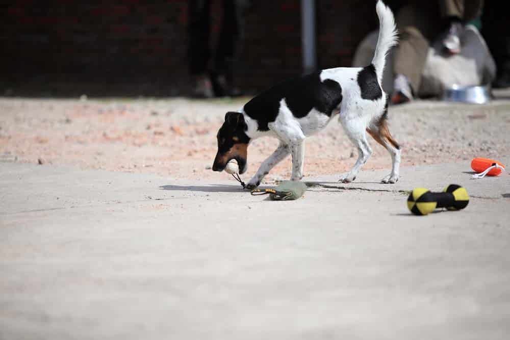Es hat sich als vorteilhaft erwiesen, wenn der Hund akzeptiert, sich nur Spuren zuzuwenden, die ihm sein Mensch anbietet. Dazu wird ihm zunächst nähergebracht, nur Gegenstände oder Dummys als interessant und lohnenswert anzusehen, an denen Geruchsspuren seines Menschen anhaften und von fremden unerwünschten Gegenständen zu lassen, die sich dadurch auszeichnen, dass sie keine Geruchspuren des Hundebesitzers an sich tragen. Auch hier nutzen wir wieder Dummys, um dem Hund die Bedeutung von »Nein!« näherzubringen. Im Laufe der Zeit lässt sich der Hund immer besser über »Nein« davon abhalten, sich fremden und damit unerwünschten Spuren zuzuwenden. Dazu gehen Sie wie folgt vor: Bitten Sie andere Hundebesitzer einige Gegenstände oder Dummys ihrer Hunde in einem Kreis abzulegen. Dazwischen positionieren Sie zum Beispiel Ihre Schuhe, Handschuhe o.ä. und/oder Dummys Ihres Hundes. Nun lässt man jeden der daran beteiligten Hunde nacheinander einen Gegenstand aus dem Kreis holen. Dieser wird sogleich wieder in den Kreis zu den anderen Gegenständen zurückgelegt.