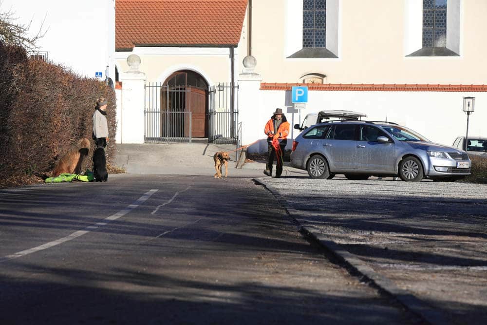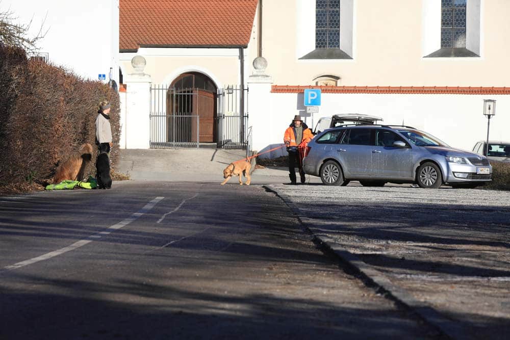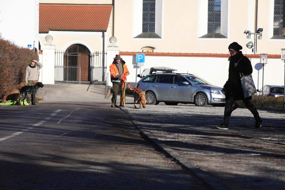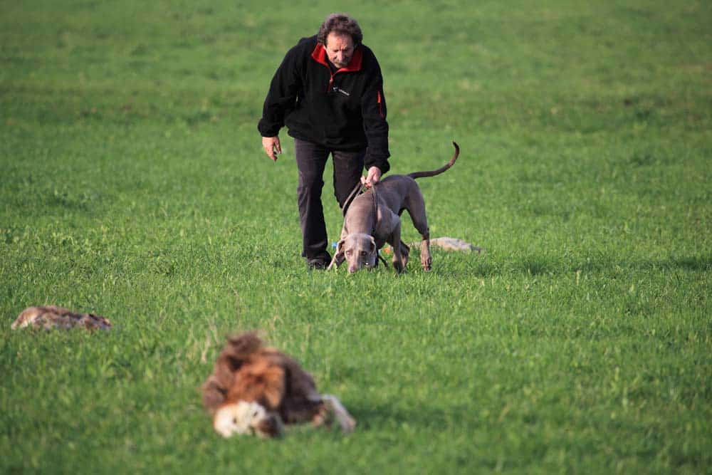 Rechts: Die Hündin soll sich auf ihre Aufgabe – die Personenspur zu verfolgen – konzentrieren und die Hunde links ignorieren. Eine Selbstzügelung wird durch Reizermüdung bewirkt. Die Hündin lässt sich kurz durch die »geparkten« Hunde ablenken. Der Hundeführer beschränkt dabei in »passiver« Weise die Länge der Leine und wartet so lange ruhig und geduldig, bis sich die Hündin von selbst wieder der Spur zuwendet.