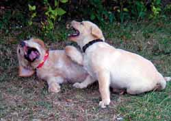 Immer, wenn Sie mit mehreren Hunden unterwegs sind, neigen unsere Vierbeiner dazu, insbesondere die jüngeren, sich den Aktivitäten der anderen anzuschließen und sich deren Verhaltensweisen – leider meist die schlechten! – abzuschauen und anzueignen. Gehen Sie beispielsweise neuerdings mit einer Gruppe spazieren, in der sich ein Hund dadurch hervor tut, dass er eine Fährte als erster riecht und dann auf und davon ist, wird sich Ihr sonst so zuverlässiger Vierbeiner in der Regel davon anstecken lassen und mit der Zeit ebenfalls eine Karriere als „Fährtenprofi" machen. Meist erlernt der Hund die schlechten Angewohnheiten anderer schleichend und ohne dass der Halter den jeweiligen Situationen eine größere Bedeutung beimisst. Das Erwachen kommt oft erst, wenn sich das schlechte Verhalten bereits sehr weit gefestigt hat und dann nur durch größere Anstrengungen wieder abgewöhnt werden kann. Auf die gleiche Art und Weise übertragen sich aber auch die positiven Verhaltensweisen der großen Vorbilder. Sie sollten sich dessen ständig bewusst sein und das Verhalten Ihres Hundes immer genau beobachten, damit Sie umgehend eingreifen können.