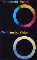 Bei Hund und Katze spricht man von dichromatischem Sehen (mit 2 Arten von Zapfen) im Gegensatz zum trichromatischen Sehen (3 unterschiedliche Arten von Zapfen) des Menschen, bei dem alle Wellenlängen des sichtbaren Spektrums wahrgenommen werden.