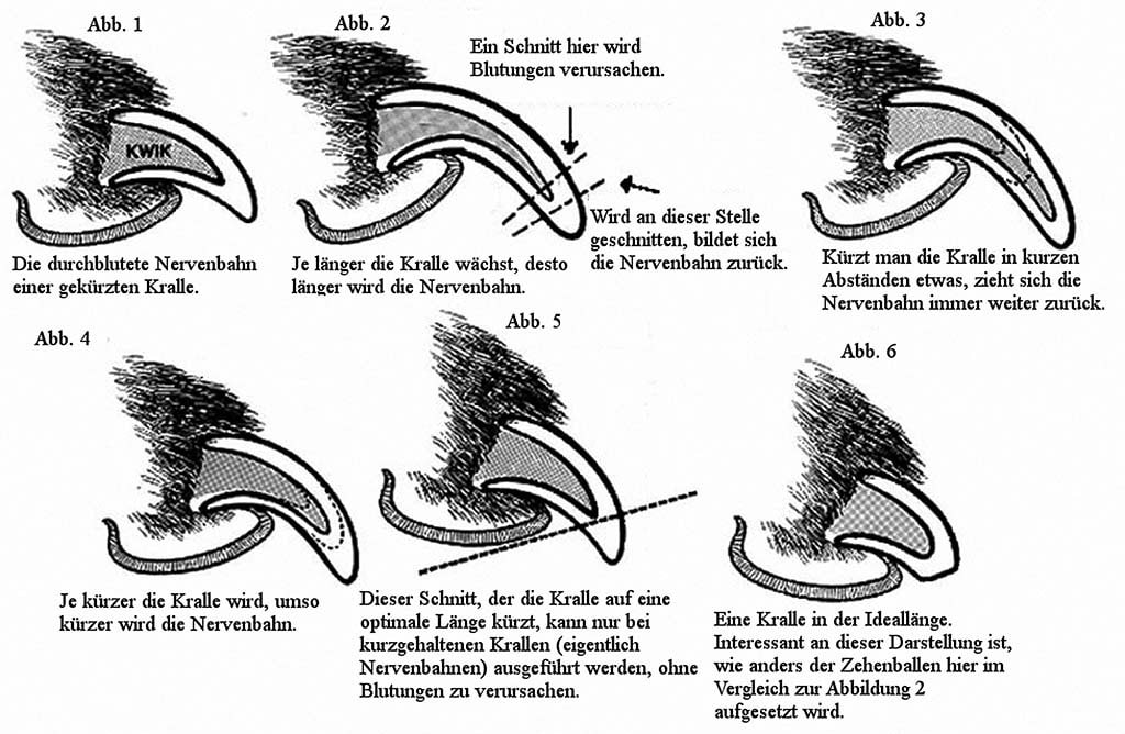 Grundsätzlich gibt es eine sehr einfache Regel. Wenn der Hund auf geraden Beinen vor einem steht, darf keine der Krallen den Boden berühren. Weiter sollte man darauf achten, dass die Kralle nicht länger ist als der dazugehörige Zeh. Die After- oder Wolfskralle ist ein besonderer Fall und muss regelmäßig gekürzt werden, da sie sich nicht abnutzt und der Hund leicht mit ihr hängen bleibt oder sie einwachsen kann.