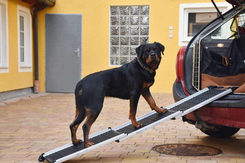 Dass die voll ausgefahrene Rampe etwas wippt, lässt sich konstruktionsbedingt nicht verhindern, aber es ist wirklich nur minimal. Bei sensiblen Hunden ist es sinnvoll, die Rampe zuerst auf den Boden zu legen und den Hund mit Motivation (z.B. Futter oder Spielzeug) daran zu gewöhnen. Das getestete XL-Modell ist für Einstiegshöhen von 70–80 cm geeignet, funktioniert natürlich auch bei niedrigeren Autos, aber da wäre das Standard-Modell passender. Belastbar ist sie (auf 4 Pfoten) bis 85 kg – aber davon ist die Test-Rotti-Hündin aus der WUFF-Redaktion weit entfernt …
