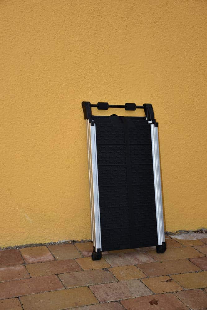 Diesmal habe ich einen sehr nützlichen Gegenstand für den Hundehalter-Alltag zum Testen ausgesucht. Für große Hunde ist es nicht besonders gesund, aus dem Auto zu springen. Wenn sie älter werden und Rückenprobleme bekommen, sollten sie solche Sprünge auch vermeiden – vor allem, wenn der Abstand zum Boden hoch ist (wie z.B. bei einem SUV). Aber auch junge Hunde sollen keine steilen und abrupten Sprünge machen. Einen sechs Monate alten Beagle kann man ja noch ins Auto heben, aber einen Bullmastiff schon nicht mehr. In solchen Fällen sollte man sich eine Hunderampe zum Ein- und Aussteigen anschaffen. Wichtig ist dabei, dass die Rampe stabil, aber trotzdem handlich bleibt, da sie ja immer dabei sein soll.