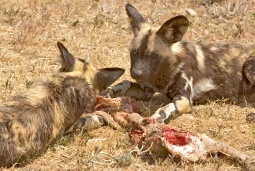 Apropos „er kriegte“: Gerade der Zugang zum Futter und anderen lebenswichtigen Nahrungsressourcen ist bei Hundeartigen nachgewiesener­maßen nicht an die Rangposition gekoppelt. Eine Vielzahl von Studien an Wölfen, verwilderten Haushunden und auch von in Familien lebenden Hunden zeigt immer wieder, dass beim Futter eine ganz andere Beziehung gilt: Wer am lautesten und glaubwürdigsten schreit „ich habe Hunger“ (im Zweifelsfall der ­Beagle!), der bekommt dann auch zuerst das Futter. Mit diesem sogenannten mo­tivations-/bedarfsabhängigen System ist es einem Wolfsrudel, einer Gruppe von Döner fressenden Müllkippenhunden oder auch einem Rudel afrikanischer Wildhunde jederzeit möglich, schnell und ohne große Diskussion über Rangpositionen eine vorhandene Nahrungsquelle zu nutzen. Und zwar so schnell, dass die Konkurrenz, sei es die aus dem Nachbarrevier oder auch aus einer größeren und stärkeren Art entstammend, keine Chancen hat.
