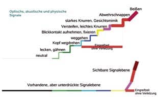 In dem Diagramm wird deutlich, wie wichtig es ist, die Signale (auch Knurren) zu beachten und keinesfalls zu ignorieren oder gar zu unterdrücken. Der Aussage „Der Hund ist kinderlieb" ist immer mit Vorsicht zu begegnen. Egal, ob es sich dabei um eine Pauschalisierung einer Rasse, einer Zuchtlinie oder um ein Individuum handelt. Diese Aussage suggeriert, dass Hunde Kinder als Kinder erkennen. Das heißt, den Begriff „Kind" kennen, nach menschlichen Maßstäben bewerten und ihren Umgang darauf abstimmen würden.