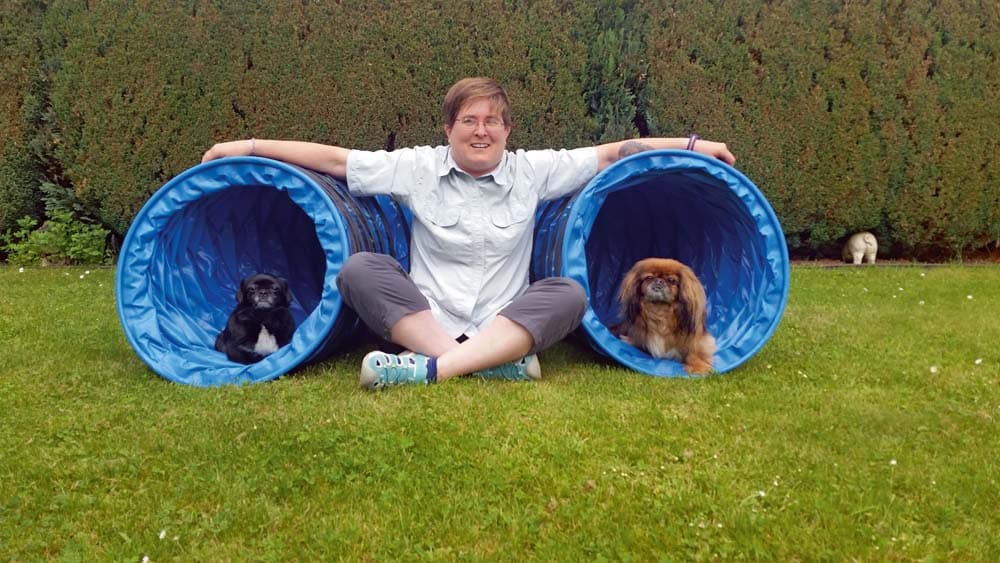Susanne Jensch erzieht gleich zwei asia­tische Heinzelmännchen, die ­Pekingesen-Damen Swiffy und Phinnia: „Swiffy habe ich von völlig überforderten Haltern übernommen. Sie war erst ein paar Wochen alt und ich war schon der 4. Besitzer. Nach ein paar Tagen war klar: Sie bleibt und ich werde nun „Kleinhundehalter“, bisher hatte ich ja nur große. Swiffy war in der ­Hundeschule, hat einen Begleithundekurs gemacht. Wir haben einige Agility-Kurse, Freizeittraining für gehandicapte Hunde gemacht und bei einem Wochenend-Trick-Kurs war die Prinzessin auch dabei. Swiffy liebt das Clickern und hat mit inzwischen 12 Jahren noch immer Spaß daran, ihre lustigen Tricks zu zeigen. Phinnia hab‘ ich mit geschätzten 2 Jahren aus der Tierherberge Donzdorf übernommen. Sie kommt ursprünglich aus einer Tötungsstation in Ungarn und war bei Berührungen seitens Menschen so voller Angst, dass sie in eine völlige Starre gefallen ist. Mit Phinnia hab ich nie eine Hunde­schule besucht. Mir ist wichtig, dass ­meine Hunde alltagstauglich sind, eine gute Grundausbildung, die ich inzwischen selbst übernehme, reicht für uns also völlig aus. Phinnia ist inzwischen 6 Jahre alt und lebt mit den Hunden und meiner kleinen Tochter harmonisch zusammen. Ich bin der Meinung, dass Hundeerziehung nicht von der Größe abhängig ist. Kleine Hunde sollen, wollen und müssen erzogen und geistig beschäftigt werden. Auch ein kleiner Hund kann für sich und seine Umwelt zur Gefahr werden, wenn er unterfordert ist oder keinen zuverlässigen Grundgehorsam hat. Wären meine Hunde nicht gut handelbar, könnte ich mich auch nicht auf die Arbeit für meinen Shop „Pekilotta Lu – Kleine Schätze für Mensch und Tier“ konzentrieren. Allerdings gebe ich zu: Meine großen Hunde werden noch konsequenter erzogen als die kleinen. Die Minis werden schon auch mal (v)erzogen und ich lass’ denen Sachen manchmal durchgehen, die die Großen nicht dürfen“.