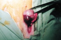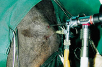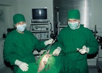 Die Hautöffnungen selbst sind ca. 1 cm lang, während die tiefer gelegene Öffnung des Bauchfells selbst nur 5 mm im Durchmesser beträgt. Trotzdem ist es möglich, durch diese kleinen Öffnungen z.B. eine Hündin zu kastrieren oder einen kryptorchen Hoden (Hoden in der Bauchhöhle) aus der Bauchhöhle zu entfernen (siehe Bild). Solche kryptorchen Hoden müssen deshalb entfernt werden, da sich sonst häufig ein bösartiger Tumor (Orchidom) in ihnen entwickelt. In beiden Fällen war bisher immer eine aufwändige Bauchoperation mit all ihren Nachteilen (großer Schnitt, höherer Blutverlust, längere Narkose, längere Erholungsphase) notwendig. Durch eine endoskopische Operation ist nicht nur die Traumatisierung (Verletzung des Gewebes durch die Operationswunde) geringer, sondern auch die Operationszeit mit etwa 15 Minuten wesentlich kürzer. Die Patienten sind kurz nach der Operation wieder völlig fit und können ohne Gefahr spätestens am nächsten Tag wieder herumlaufen und springen. Die schlitzförmigen Öffnungen der Bauchmuskulatur sind nämlich so klein, dass sie nicht einmal genäht werden müssen, da sie sofort von selbst verkleben. Also eine nicht nur schonende, sondern auch sehr „elegante" Operationsmethode.