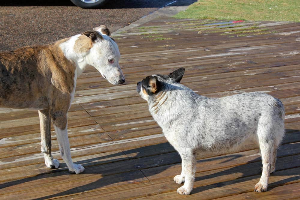 Auch im täglichen Umgang mit fremden Hunden kann es nötig sein, Klartext zu sprechen. Kommt Ihnen und Ihrem Hund beispielsweise auf einem schmalen Weg ein Hund entgegen, dessen angespannte Körpersprache nichts Gutes verheißt, so gehen Sie einen Bogen, um den potenziellen Kontrahenten vorbei zu lassen. Dieser Umweg wirkt deeskalierend und heißt: Ich will nichts von Dir, also lass mich bitte auch in Ruhe. Wichtig dabei ist, dass Sie den Bogen ruhig und entspannt gehen, um so auch Ihrem Hund zu sagen: „Ich hab‘ alles im Griff. Komm, wir lassen den anderen Hund einfach vorbei.“ Eine weitere Möglichkeit, deeskalierend zu agieren und Konfrontationen zu vermeiden, ist das Wegblicken. Denn „In die Augen sehen“ wirkt provokant auf einen fremden Hund.