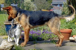 An die im Haushalt lebenden Katzen wurde Gilbert langsam herangeführt. Aufgrund des fehlenden Lidschlussreflexes beim blinden Hund ist Vorsicht geboten. Nicht jede unserer Katzen ist mit Hunden so vertraut wie Ratz oder Rübe. Daher ist Gilbert mit den Katzen nie unbeobachtet zusammen.