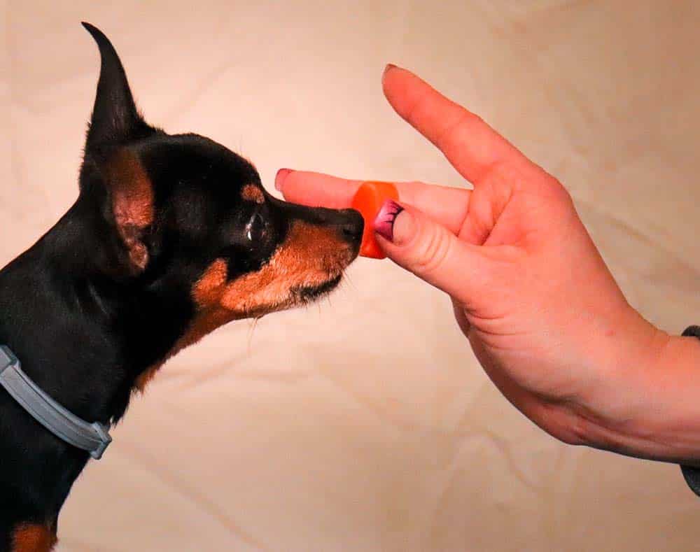 Zahnkontrolle: Dafür würde ich ein Bodentarget aufbauen. Am einfachsten unterteilt man eine Übung in lauter kleine Einzelteile, die nach und nach trainiert werden und zu einer Kette zusammengefügt werden. Hierfür würde ich erst einmal das Bodentarget aufbauen, um das fixe Stehenbleiben auf einem Gegenstand zu trainieren. Hat der Hund das Bodentarget verinnerlicht, kann man mit dem nächsten kleinen Schritt beginnen. Nehmen wir dafür das Anheben der Lefzen: Der nächste Schritt bei dieser Übung ist, dass die Hand des Halters langsam in Richtung Maul des Tieres geht. Jedes Mal, wenn der Hund dabei nicht zurückweicht, gibt es ein Markerwort (gut, prima, …) was bedeutet: »das hast du gut gemacht«, gefolgt von einer Belohnung (z.B. Futter). Das Markerwort ist die Ankündigung für eine Belohnung und somit ein Versprechen, dass etwas Tolles kommt.