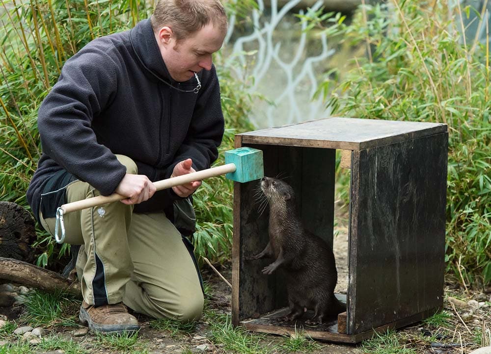 »Tierärztliche Untersuchungen wie Ultraschall zu üben oder kleinere Manipulationen durch die Tierpfleger, wie Nagelfeilen im Rahmen des Trainings zu simulieren, hilft den Zootieren diese mitunter notwendigen Maßnahmen in entspannter Atmosphäre zu bewältigen. Wir üben zum Beispiel mit den Orang-Utans regelmäßig auf ein bestimmtes Zeichen das Maul zu öffnen. Sollten sie in Zukunft Zahnprobleme bekommen, lassen sie auch den Tierarzt nachsehen.«