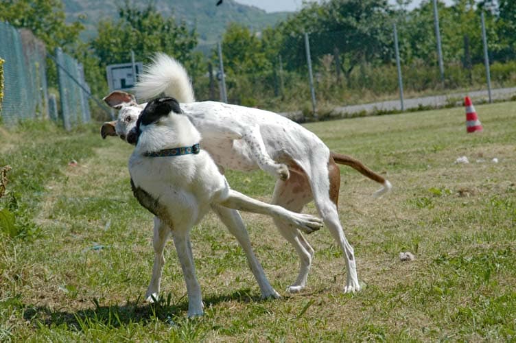 Erstkontakte, die so ablaufen, dass beide Hunde gleich abgeleint (oft mit Maulkorb versehen) und ohne Vorbereitung aufeinander „losgelassen" werden, können zwar gut ausgehen, die Tiere aber weitaus wahrscheinlicher so überfordern, dass das erste Mal zum Debakel wird. Stress, Angst und Unsicherheit sind schlechte Begleitumstände für ein höfliches Kennenlernen. Manchmal sieht es auf den ersten Blick so aus, als ob Hunde sofort zu spielen beginnen und fröhlich umher tollen. Doch Achtung! Nicht alles, was einem Spiel ähnelt, ist auch so gemeint. Besonders unsichere oder überdrehte Hunde beginnen in stressigen Situationen mit einer Art „Kasperltheater", Herumgehüpfe oder Rennspielen, die ebenso schnell in Aggression ­kippen können wie sie begonnen haben. Unbeschwertes Spielen setzt Vertrauen in den Spielpartner voraus und das ist bei einer Erstbegegnung eher selten der Fall.