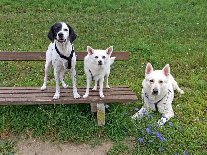 Schon manches Kennenlernen scheiterte im letzten Moment an mitgebrachten Leckerchen. Selbst wenn die Hunde sich auf Anhieb gut verstehen, können Leckerchen das junge Glück schnell zerstören. Leckerchen dürfen den Hunden während des Spazier­ganges in sicherem Abstand verabreicht werden, aber bitte nicht, wenn sie beieinander stehen und sich gerade erst beschnuppert haben. Es gibt auch andere Möglichkeiten, Zuneigung zum Ausdruck zu bringen oder gutes Betragen zu belohnen. Um Futterneid gar nicht erst aufkommen zu lassen, Leckerlitasche oder Futterbeutel außerhalb des Geländes belassen. Dasselbe gilt natürlich für begehrtes Spielzeug. Bällchen oder Stöckchenwerfen ist in einer solchen Situation tabu, da es die Hunde hochputscht und Konkurrenzverhalten auslösen kann. Zeigen beide Hunde die Bereitschaft, mehr Nähe zuzulassen, kann Streicheln viel zur Wohlfühl- Atmosphäre beitragen. Wenn sich Interessent und Betreuer in die Mitte setzen und die Hunde außen platziert werden, können diese in entspannter Distanz ihre Streicheleinheiten genießen. Der Körperkontakt zur Bezugsperson gibt Sicherheit und beruhigt. Reagiert einer der Hunde eifersüchtig, einfach den Abstand vergrößern oder auseinander gehen.