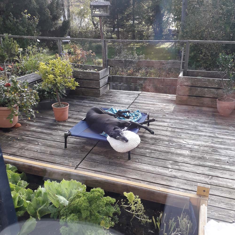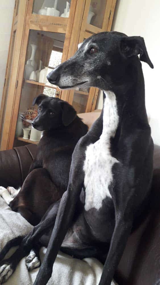 Die gemeinsame Geschichte von Halterin Christine W. und Negra begann im Juni 2011: »Da habe ich Negra auf der Internetseite des Tierheimes Landsberg unter Privatvermittlungen gesehen. Negra war zu diesem Zeitpunkt bereits seit 14 Monaten auf ihrer Pflegestelle, sie war aus Spanien gekommen. Ich war auf der Suche nach einem zweiten Hund zu meinem Rüden Pippo. Der Zweithund sollte wie er Rennspiele lieben. Negra sah meinem Rüden sehr ähnlich. Aufgrund des ausgeprägten Jagdinteresses und einer Behinderung war Negra nicht einfach zu vermitteln. Sie mochte auch nicht jeden Interessenten. Einmal hat sie sogar einer sehr nachdrücklichen Interessentin schlussendlich ans Bein gepieselt. Nach einem ausgiebigen Probespaziergang gemeinsam mit Pippo, die Beiden mochten sich auf Anhieb, und ein paar Tagen Bedenkzeit holte ich Negra dann an meinem ersten Urlaubstag ab. Sie ließ sich problemlos ins Auto heben, das mache ich bis heute immer, und das Pflegefrauchen kämpfte mit Tränen.«
