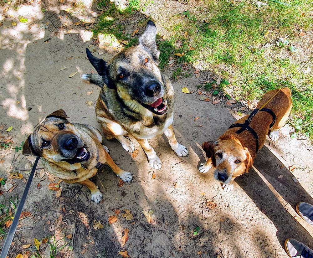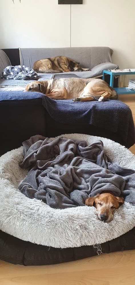 Bedingt durch seinen schlechten gesundheitlichen Zustand und sein Vorleben, war auch die Eingewöhnung in sein neues Zuhause nicht ganz einfach. Besonders einer der zwei im Haushalt lebenden Hunde mied den Neuzugang wie der Teufel das Weihwasser: »Als wir mit Piccolino nach Hause kamen, nahm unser stolzer Rüde Nanju erst mal Reißaus vor dem kleinen Piccolino. Nanju konnte wohl Piccolinos Gestank nicht ertragen. Mit der Hündin Lene klappte es auf Anhieb. 14 Tage lang lag Nanju ausschließlich auf meinem Bett, da Piccolino dort nicht hochkam. So konnte es nicht weitergehen, und als wir nach einer Krisensitzung entschieden, die Vermittlerin anzurufen, um ihr zu sagen, dass es mit den Hunden leider nicht klappt, taute Nanju von heute auf morgen auf und schlief freiwillig wieder im Wohnzimmer – bei Lene und Piccolino. Von da an war das Eis gebrochen, und Piccolino klebte etwa drei Monate an Nanju. Er verfolgte ihn auf Schritt und Tritt und schlief ausschließlich bei ihm im Körbchen. Nanju ertrug es mit stoischer Geduld. Heute sind alle drei Hunde ein zusammengewachsenes Rudel, und Piccolino wird von den zwei großen Hunden gegen andere Hunde verteidigt. Das muss man immer im Auge behalten«, erzählt Sina Schmitt über die Eingewöhnung mit den drei Hunden.