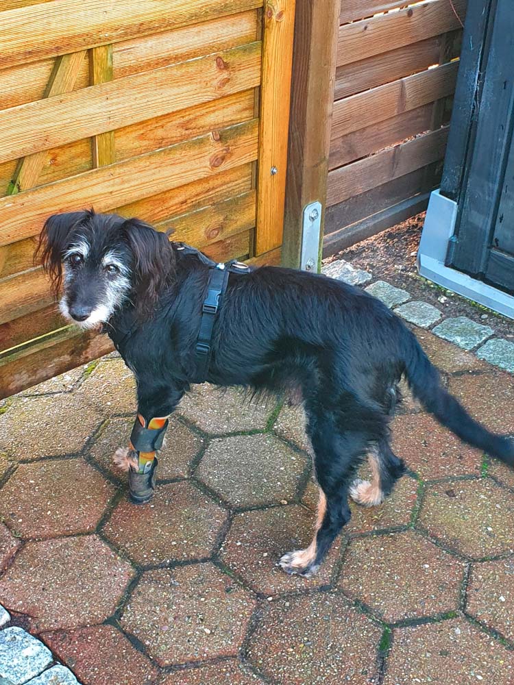 »Eddie war am Anfang unsicher und unruhig, er brauchte viel Zeit zur Orientierung. Er entwickelte sich aber zu einem pfiffigen Opi. Er legte Wert darauf, dass man pünktlich mit ihm spielte und zu feststehender Zeit mit ihm seine Runden drehte. Er war hier im Ort bekannt, und besonders von älteren Damen und Herren aus dem Altenheim wurden wir sehr oft angesprochen und seine Orthese wird mit viel Verständnis und Einfühlungsvermögen begutachtet. Spazierengehen und mit anderen Hunden flirten, davon konnte er nicht genug bekommen. Außerdem war er – trotz seines Handicaps – ein leidenschaftlicher Buddler und hatte sich in unserem Garten diesbezüglich richtig ausgetobt. Er war insgesamt ein unglaublich sanfter und gleichzeitig vorwitziger Hund und war, trotzdem er so schwer verletzt worden war, jedermann gegenüber freundlich und aufgeschlossen«, beschreibt ­Elisabeth P. Eddie. Im Oktober 2020 wurde bei Eddie auch noch das Vestibularsyndrom diagnostiziert, an dem er schlussendlich im April 2021 verstorben ist.
