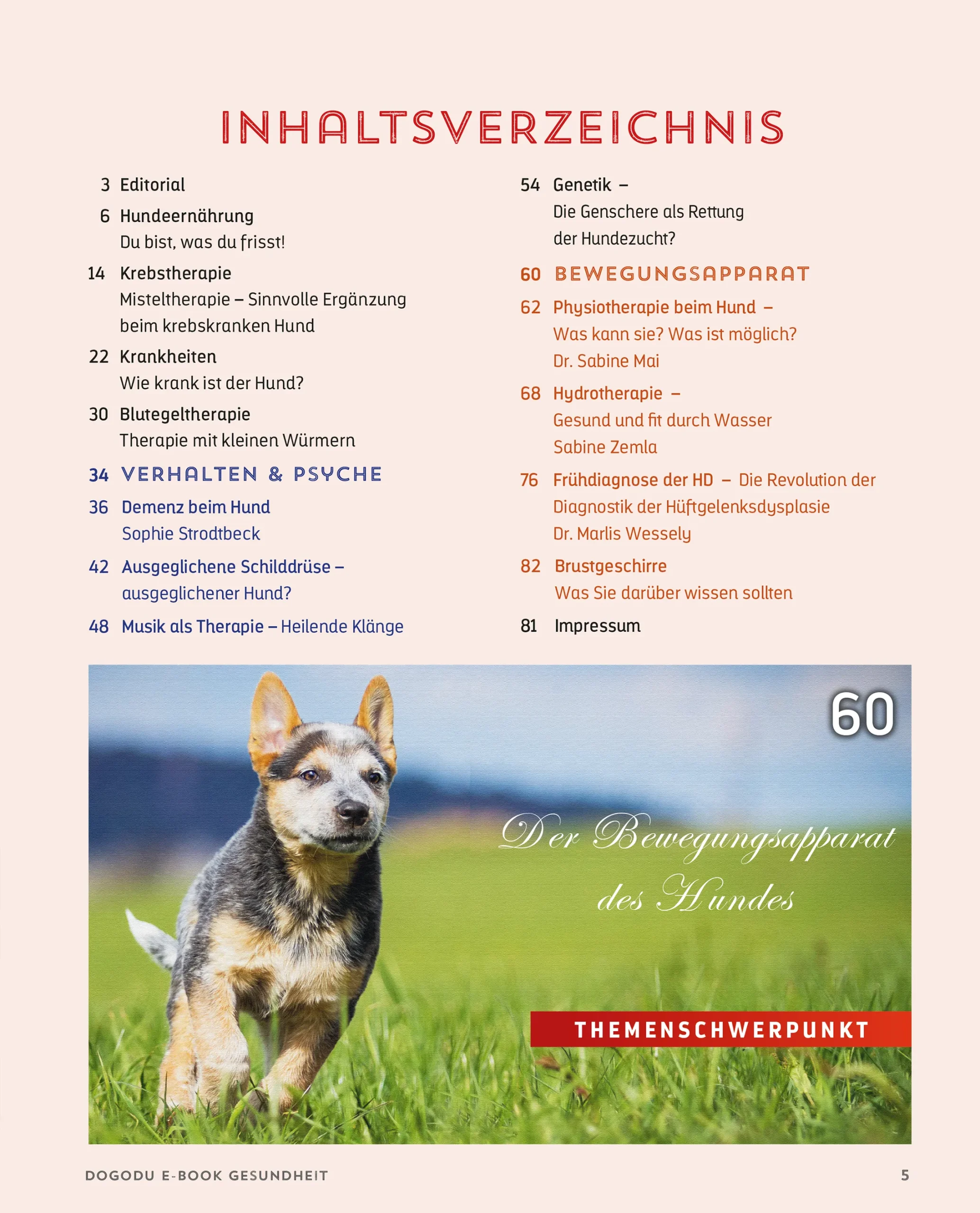 Dieses umfangreiche E-Book mit 90 Seiten widmet sich dem Thema Hunde-Gesundheit. Es beinhaltet ein riesiges interessantes Themenspektrum mit zwei zusätzlichen Themenspecials.