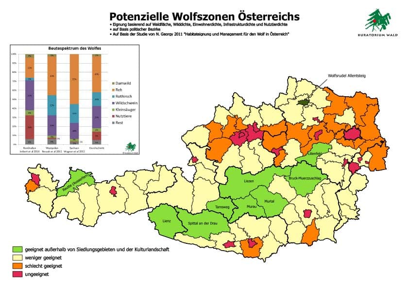 Truppenübungsplätze scheinen das ideale Areal für Wolfsansiedlungen zu sein, denn auch in Österreich hat sich auf dem Truppenübungsplatz Allentsteig nach vielen Jahrzehnten – in Österreich galt die Art ab 1882 als ausgestorben –, das erste Wolfsrudel niedergelassen. Ein einzelner Wolf wurde erstmals 2015 gesichtet, ein erstes Wolfspaar im Januar 2016 und schließlich konnten im Sommer 2016 mit einer Wildkamera erstmals fünf Jungwölfe festgehalten werden. Der VgT (Verein gegen Tierfabriken) hält fest, dass das in Allentsteig angesiedelte Wolfsrudel im Jahr 2017 kein einziges Nutztier gerissen, keinen Menschen bedroht, den Truppenübungsplatz nie verlassen und auch keine anderen Wölfe ins Revier gelassen habe. Ernährt hätten sich die Wölfe hauptsächlich von Hirschen. Der VgT hat berechnet, dass dieses siebenköpfige Rudel in einem Jahr rund 20% des von Menschen gejagten Wildbrets gerissen hat. Als Großraubtier bevorzugt der Wolf Hirsche, Rehe oder Wildschweine, gelegentlich auch kleinere Tiere. Ältere und kranke Tiere sind eine leichte Beute für ihn. Damit übernimmt er aber auch eine wichtige Rolle im Ökosystem, weil er die Bestände vor allem der mittelgroßen Huftiere kontrolliert.