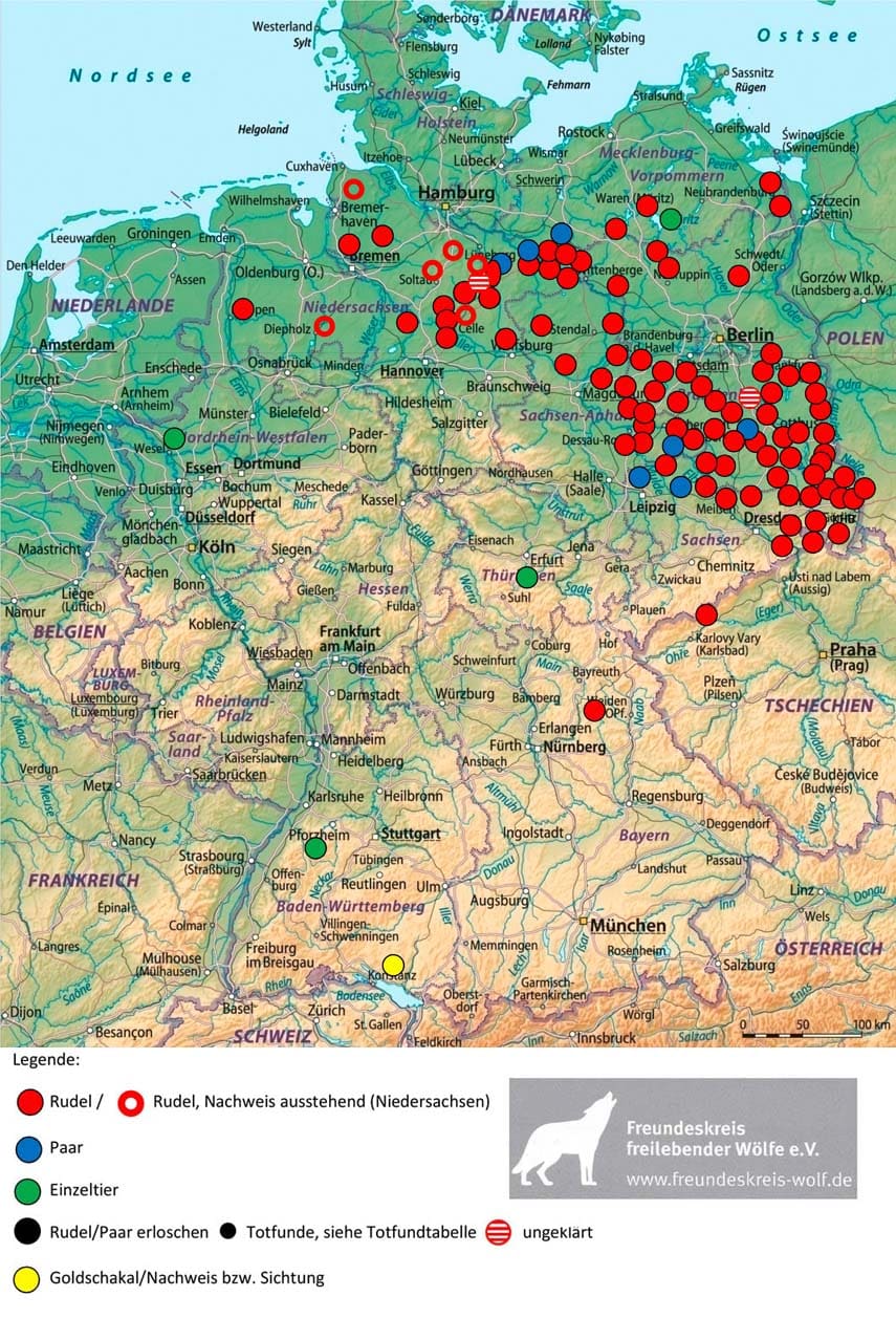 Auch in Deutschland breiten sich Wölfe seit dem Jahr 2000 wieder aus. Laut dem DBBW (Dokumentations- und Beratungsstelle des Bundes zum Thema Wolf) sind in Deutschland 73 Wolfsrudel bestätigt. Das geht aus neuen Erhebungen (Stand 11/18) der Bundesländer hervor, die durch das Bundesamt für Naturschutz (BfN) und der DBBW zusammengeführt wurden. »Das Wolfvorkommen konzentriert sich weiterhin auf das Gebiet von der sächsischen Lausitz in nordwestliche Richtung über Brandenburg, Mecklenburg-Vorpommern, Sachsen-Anhalt und Thüringen bis nach Niedersachsen. Zum ersten Mal seit der Ausrottung der Art in Deutschland vor mehr als 150 Jahren ist zudem ein Rudel in Bayern bestätigt. Die meisten Tiere leben in Brandenburg, gefolgt von Sachsen und Niedersachsen.«, so der DBBW. Wölfe stehen auch in Deutschland unter strengem Schutz.