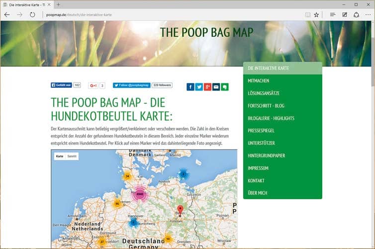 Glücklicherweise gibt es findige Köpfe, die statt Probleme Lösungen suchen. So einer ist der Hamburger Arne Krämer. Er wurde auf die gefüllten Hundekotbeutel beim Joggen und beim Fischen, wo er die Hundekotbeutel in den Büschen und am Haken fand, aufmerksam. Sein Interesse war geweckt und er fing an, sich im Rahmen seiner Bachelor Arbeit mit dem Hundekotbeutelwegwerfproblem auseinander zu setzen. Bald war ihm klar, dass herumliegende Hundekotbeutel sowohl ein soziales wie auch ein Umweltproblem darstellen, weshalb er auch gleich zwei Lösungsansätze entwickelte. Gemeinsam mit der Firma Folag AG aus der Schweiz entwarf er biologisch abbaubare Hundekotbeutel, um möglichst viele der herkömmlichen Produkte aus PE zu ersetzen und die Umweltauswirkungen zu reduzieren. Wie jedoch Krämer auf seiner Seite www.poopmap.de betont: „Noch umweltfreundlicher wäre es, wenn Beutel und Hundekot gar nicht erst in die Umwelt gelangen." Auf diesem Grundsatz fußt sein zweiter Lösungsansatz: Die Poop Bag Map. Diese interaktive Karte soll die Aufmerksamkeit für das Kotproblem erzeugen, um ein Problembewusstsein zu schaffen und Städten wie auch Gemeinden mit dem gewonnenen Datenmaterial zu ermöglichen, die Mülleimerstandplätze zu optimieren. Jeder, ob Hundehalter oder nicht, ist dazu aufgerufen, sich an diesem Projekt zu beteiligen. Und das geht so: Entdeckt man irgendwo einen gefüllten, deponierten Hundesack, macht man mit seinem Smartphone ein Foto. Dieses Foto schickt man per Email an hundekotbeutel@outlook.de. Wichtig ist, gleichzeitig mit dem Foto auch den GPS-Standort mitzuschicken. Diese Daten werden, wenn Sie Ihr Smartphone dementsprechend einstellen, gleich mit dem Foto gespeichert. Die Standortdaten sind deshalb wichtig, weil jedes Foto auf der Poop Bag Map verzeichnet wird. Durch diese Datensammlung können Städte, Gemeinden oder Private prüfen, wo das Errichten eines Mülleimers oder Robidogs der Verschmutzung vorbeugen würde. Denn wie Krämer festgestellt hat, werden Hundesäckchen vor allem dort liegen gelassen, wo es an Entsorgungsstellen mangelt.