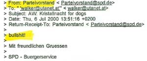 Einerseits kamen mails von Herrn Treichel (SPD Bürgerservice), der das „bullshit-mail“ als Fälschung bezeichnete. Andererseits erhielten mehrere Personen, darunter auch Catherine Walker, von Frau Winkelmann, ebenfalls aus dem SPD-Bürgerservice, eine Art Entschuldigung. Man entschuldige sich für das unakzeptierbare anonyme mail und man habe den Urheber noch nicht ausforschen können. Dieser doppelte mail-Verkehr mit entweder Bezeichnung des Walker-mails als Fälschung oder Entschuldigung fand im Juli statt. Aufgrund dieser unbefriedigenden Erklärung und dem Umstand, daß sich Frau Walker durch Bezeichnung ihres mails als Fälschung im Ruf geschädigt fühlt, ging die Sache mit zahlreichen mails über verschiedene Stellen weiter.