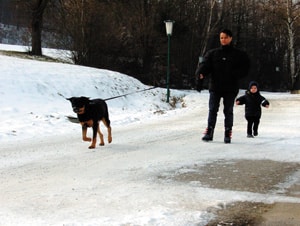 Elisabeth Cech-Harrer: Vorrangig sind Ihre Nerven wichtiger als alle Trainingsversuche. Lehnen Sie sich also ruhig zurück und überlegen Sie, wofür Sie „Fußgehen" mit Rocky im Alltag brauchen. Sicherlich nur in beengten und eventuell gefährlichen Situationen, wie z.B. beim Vorbeigehen an Baustellen, bei Menschenansammlungen, bei anderen knurrenden Hunden oder wenn Sie sich hundesportlich betätigen wollen. „Fußgehen" bedeutet eng, aufmerksam und freudig an der linken Seite des Hundebesitzers zu gehen und ist eine schwierige Gangart für einen Hund. Sie erfordert hohe Konzentration von Hund und Mensch, vergleichbar mit einem Balanceakt über einen schmalen Balken und ist daher nur für kurze Strecken geeignet. Es ist für Rocky und auch für Sie viel entspannender, wenn Sie mit ihm üben, in Ihrem Umkreis zu bleibe, und dabei seine Leinenlänge von 1-2 Meter zu nützen, ohne zu ziehen. Er soll aber trotzdem die Möglichkeit haben, zu schnüffeln, zu markieren oder die Seite zu wechseln. Als Kommando kann man für diese Übung z.B. „Bei mir!" verwenden.