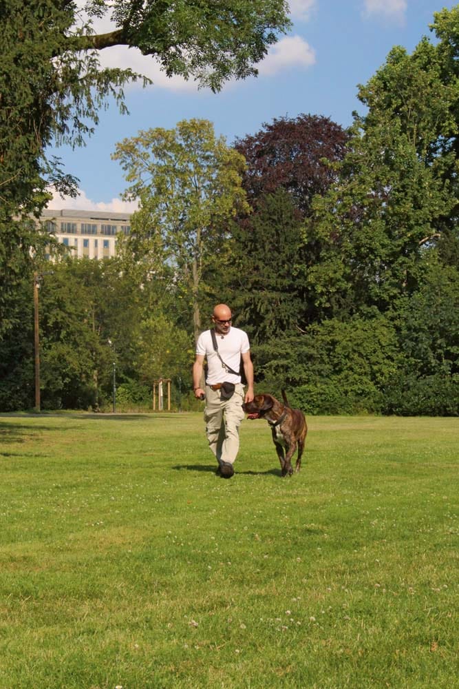 Wie anders ist doch mein kleiner Rico. Mit viel Spaß ist er bei der Sache. Ganz ohne den Stress – ja, mit viel Freude. Wir laufen entspannt das Schema für Begleithunde – kann man ja immer wieder mal einbauen beim Gassigehen. Mein kleiner Doggen-Wookiee läuft gut bei Fuß (gut, nicht so „angeklebt“ wie ein Schäferhund, er hat als Molosser halt ein eigenes Distanzbedürfnis – so wie ich). Ich wechsle das Tempo, beinahe zeitgleich beschleunigt er auch. Dann werd‘ ich langsamer, nahezu zeitgleich auch Rico …