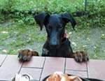 Nur der vier Monate alte Dobi Justin fürchtete sich anfangs sehr vor Georg. Kein Wunder. Zum einen hat Justin schon Schlimmes durchgemacht (sein Vorbesitzer fügte ihm mit einem Messer eine tiefe Stichwunde zu), zum anderen ist Georg schon durch seine Größe ein wenig furchteinflößend. Für ihn muß Georg sich auf den Boden legen, damit Justin sich langsam näher wagt. Nach fünf Minuten hat der kleine Dobi seine Angst überwunden und betrachtet Georg als „Kletterberg“.